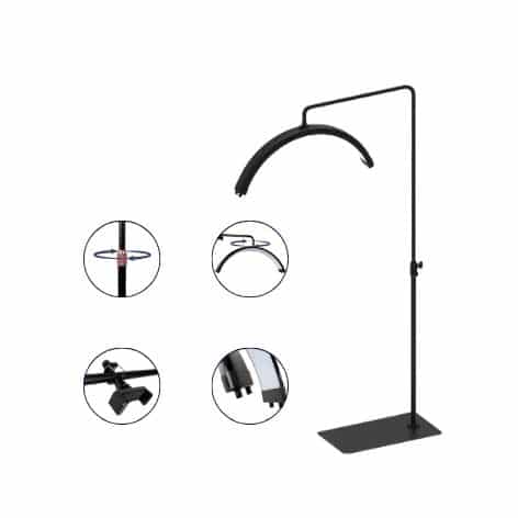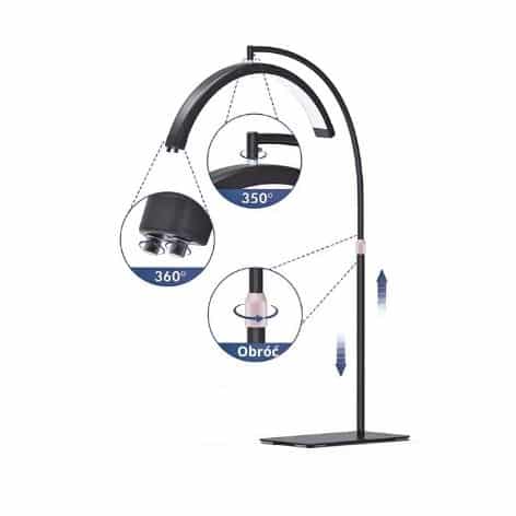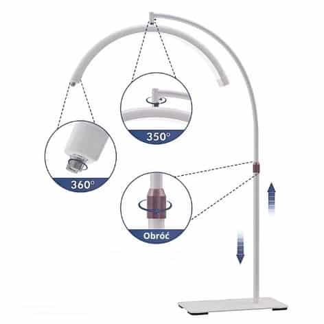 Die Lampe hat eine verstellbare Höhe von 93 cm bis 173 cm und der Lampenkopf lässt sich um 360° drehen, was maximale Flexibilität und Benutzerfreundlichkeit bietet.