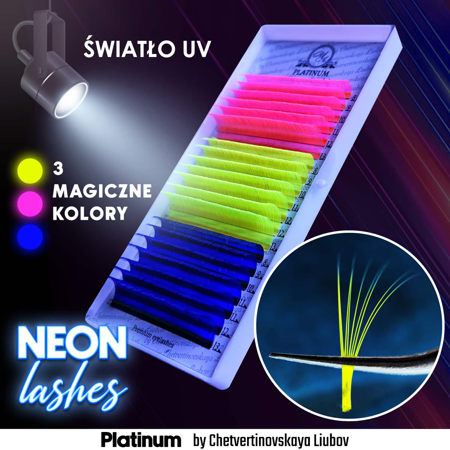 Neon eyelashes PLATINUM by Chetvertinovskaya Liubov offer a bright palette of pink, yellow, and blue. Perfect for stylists who want to create creative, eye-catching looks and add vibrant accents to any lash set.